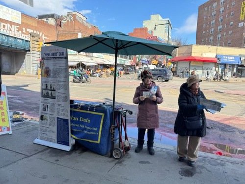 New York-i gyakorlók öt standot állítottak fel a Main Streeten, Flushingban – a város egyik legnagyobb kínai közösségében –, hogy tájékoztassák az embereket a Fálun Gongról, és cáfolják a KKP rágalmazó propagandáját. Akár milyen legyen is az időjárás, ők folyamatosan tájékoztatják az embereket a Fálun Gongról és arról, hogy a KKP hogyan üldözi azt.