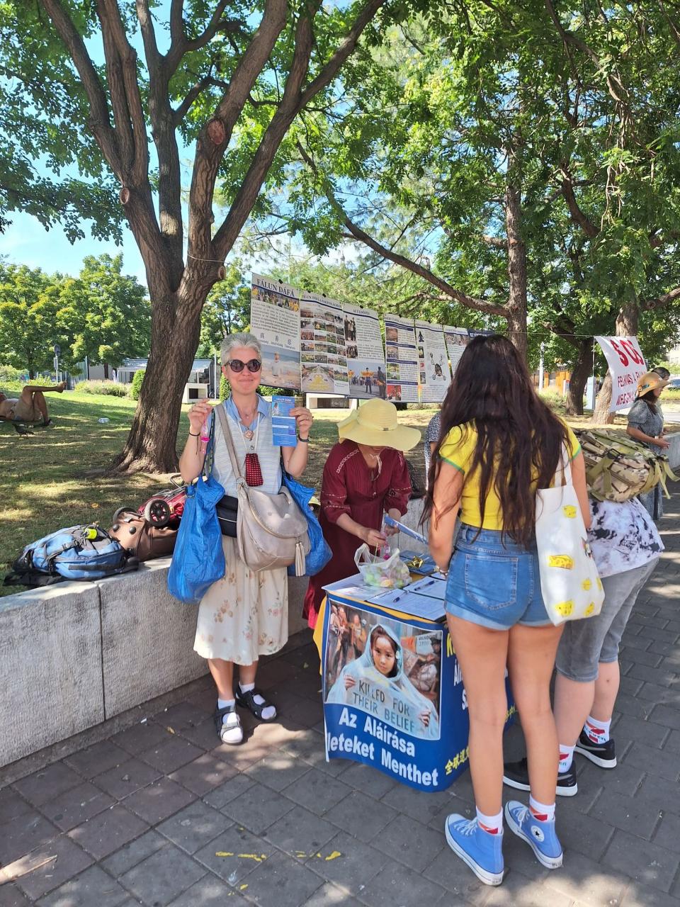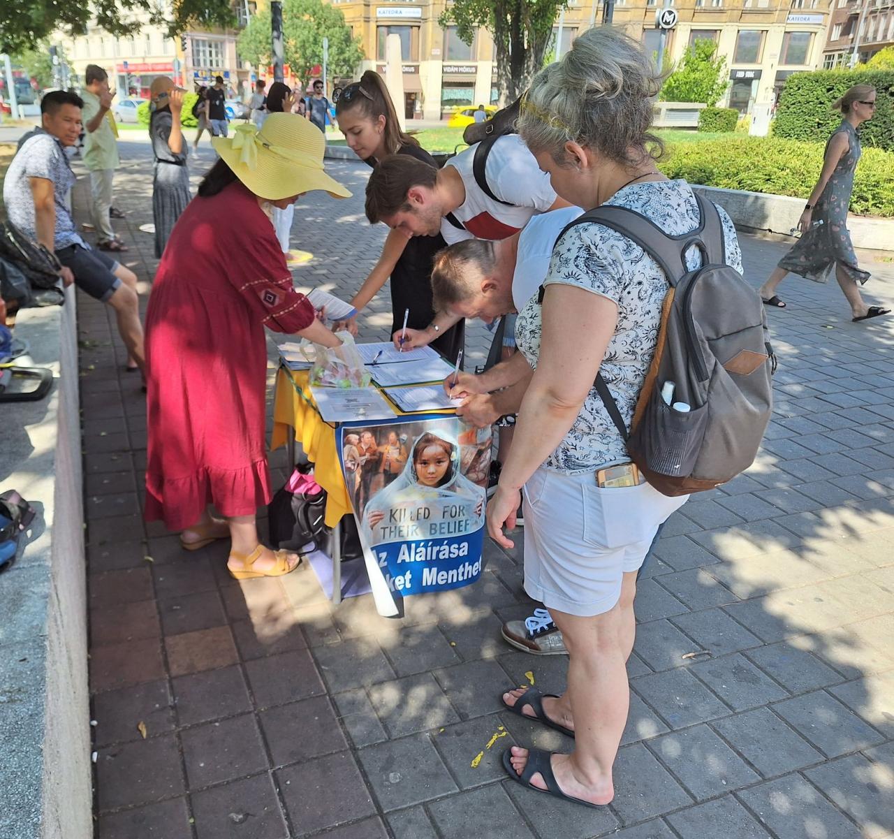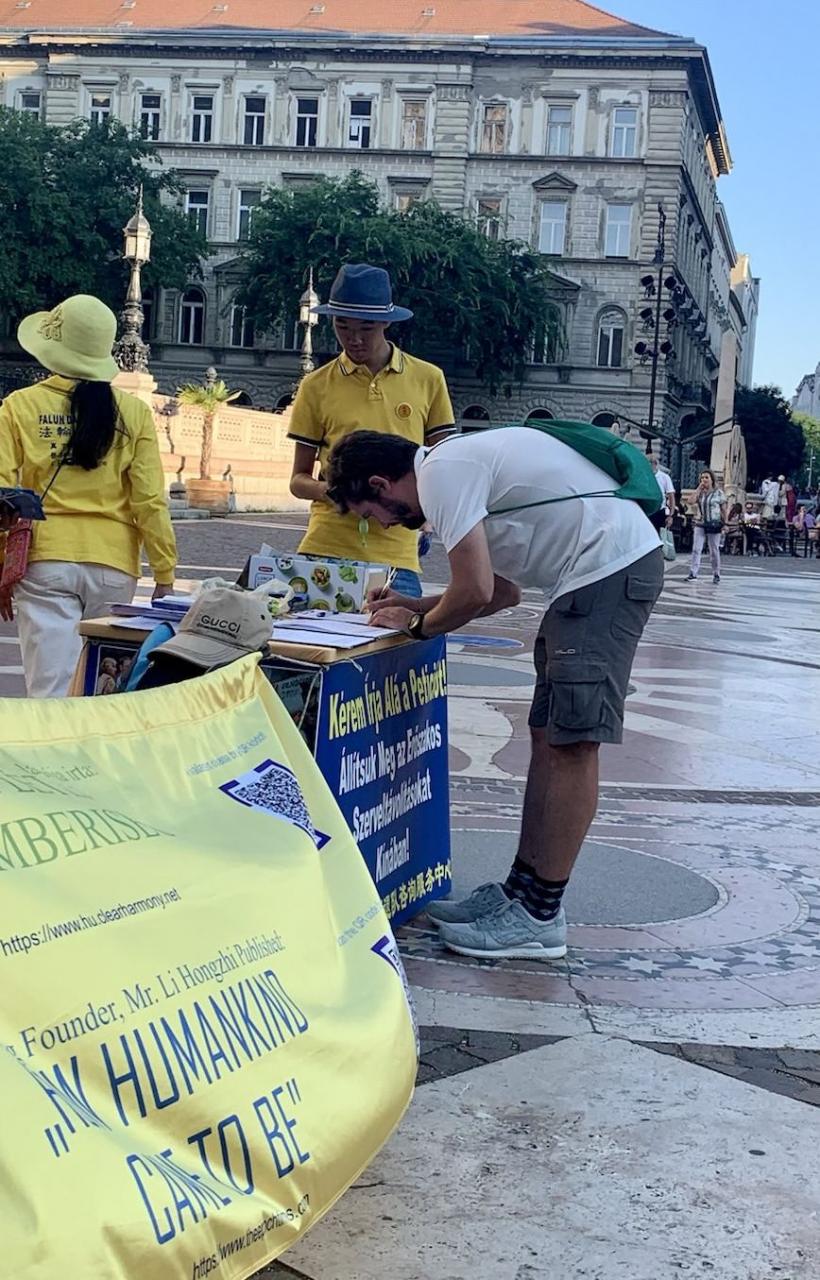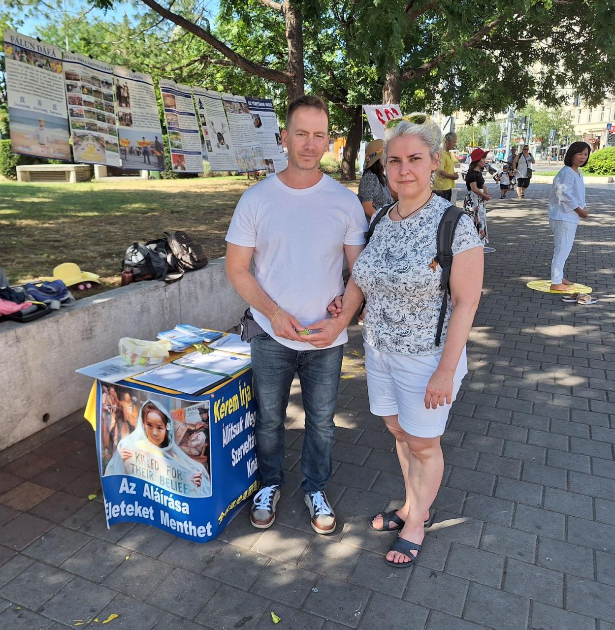 Egy budapesti pár, Emese és Tibor azért jöttek oda a pulthoz, mert az üldözést nagyon elítélik és mindenképpen támogatni akarták a gyakorlók erőfeszítéseit. Emese az egészségügyben ápolóként dolgozik, Tibor pedig az online marketing területén. Szerettek volna többet megtudni a Fálun Dáfáról és a qigong-hoz hasonló gyakorlatokról. Amikor megtudták, hogy ez a meditációs gyakorlat mennyi pozitív előnnyel jár, megkérdezték, hogyan kezdődött ez az üldözés, „egyáltalán miért kezdték el üldözni?” Emesét egészségügyi dolgozóként különösen megdöbbentette, hogy az erőszakos szerveltávolításokat katonai kórházakban végzik a KKP tudtával és irányátásával. Tibor elmondta: „Nagyon elítélem, ahogyan a Kínai Kommunista Párt a saját polgárait gyilkolja és sanyargatja. Hallottunk róla, hogy a KKP bevezetett Kínában egy kreditrendszert, amivel a saját lakosait igyekszik sakkban tartani. Ám ezt a rendszert elkezdték exportálni külföldi országokba is. Attól tartunk, hogy ennek egyes elemei megjelenhetnek nálunk is. A beszélgetés után még mindenképpen aláírjuk a pultnál az ENDCCP petícióját is. Semmiképpen nem szeretnénk, ha itt is megjelennének bármilyen formában.”