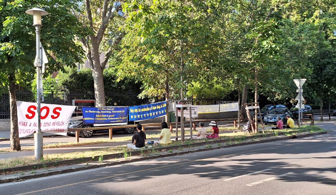 Fálun Dáfá-gyakorlók békésen demonstrálnak a budapesti kínai nagykövetség épülete előtt