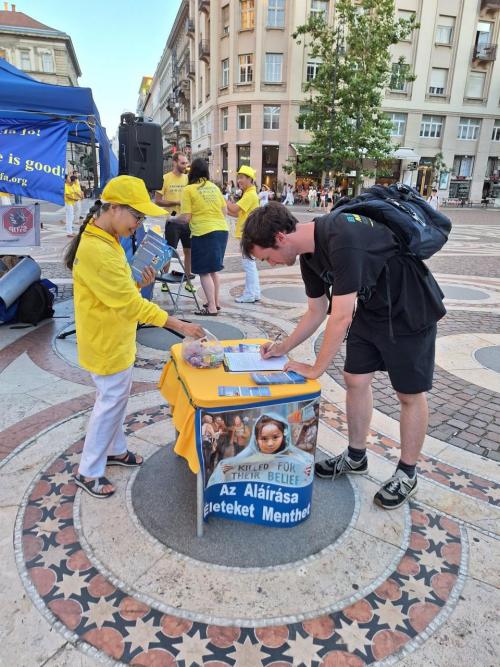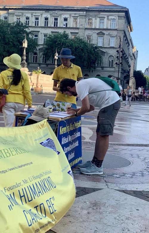A rendezvénysorozat ezen a héten, a Kínai Népköztársaság Magyarországi Nagykövetsége előtt tartott békés demonstráció után, a Deák téren folytatódott 2023 július 19-én. Többen megálltak, hogy a gyakorlatokról érdeklődjenek, és a támogatásukról biztosítsák a Fálun Dáfá követőit.