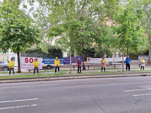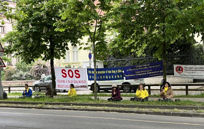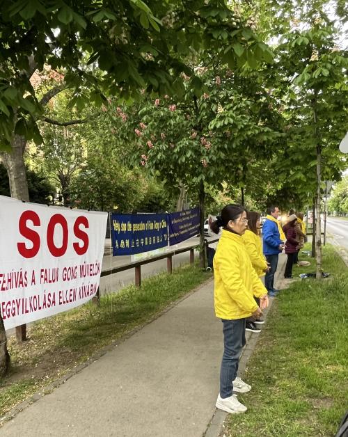Április 23-án, magyarországi Fálun Gong-gyakorlók demonstrációt tartottak a békés pekingi felhívás 25. évfordulója alkalmából a budapesti kínai nagykövetség épülete előtt.
