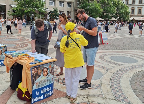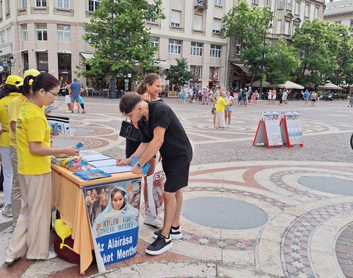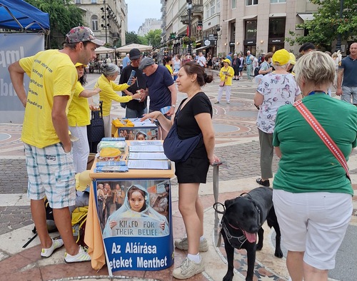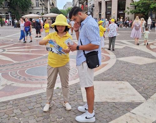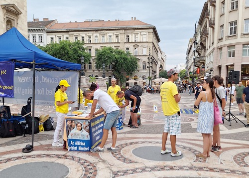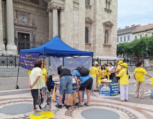 (Minghui.org) A gyakorlók 2024. július 20-án állítottak fel egy információs standot a Szent István Bazilika előtt, Budapest egyik legnépszerűbb és legfontosabb műemlék épületénél, hogy felhívják a figyelmet a Fálun Dáfá 25 éve tartó üldözésére Kínában.