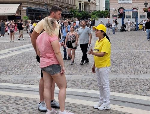 Egy középkorú nő egyenesen a pulthoz lépett, hogy aláírja a petíciót. Miután egy ideig beszélgettek a Fálun Dáfáról és a KKP által folytatott üldözésről a gyakorlóval elmesélte neki, hogy három vagy négy évvel ezelőtt ő már elkezdte gyakorolni a Fálun Dáfát egymagában, de aztán abbahagyta.